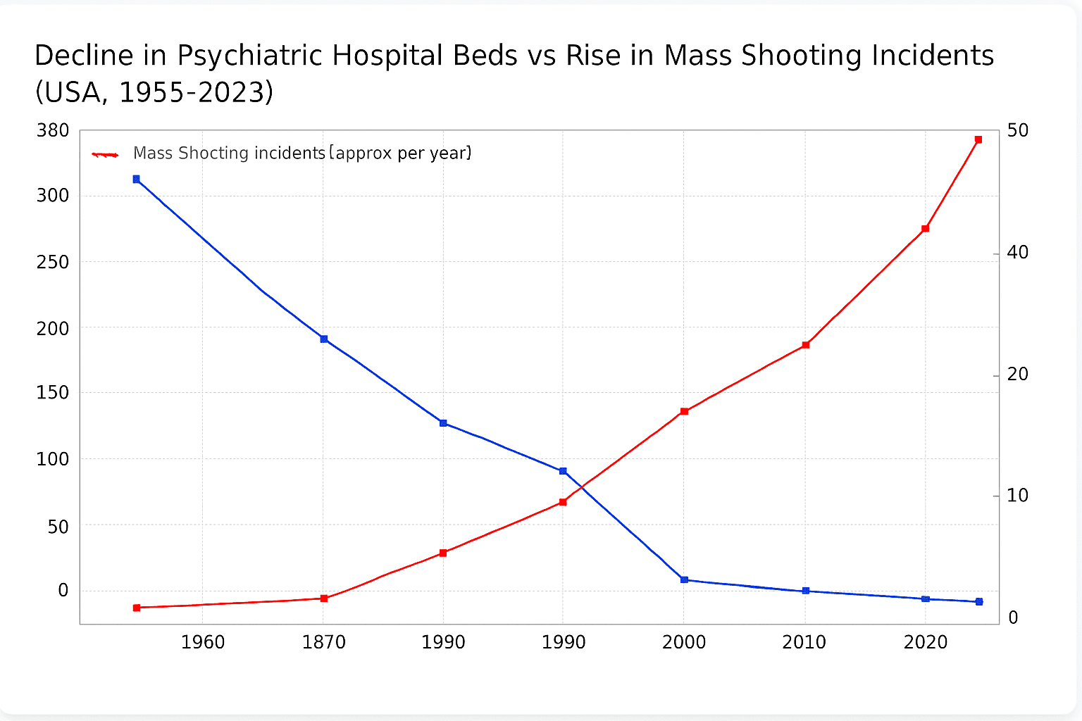 Since the mid-20th century, the United States has dismantled much of its mental health infrastructure. In 1955, there were roughly 339 state psychiatric hospital beds per 100,000 people. By 2000, that number had fallen to just 22 beds per 100,000 — and today it’s closer to 10 beds per 100,000, an over 90% decline in capacity.